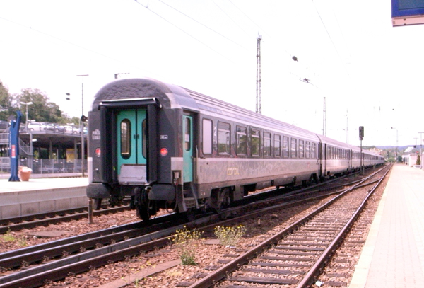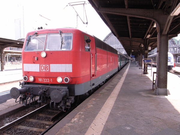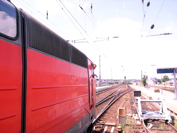 | 牽引はドイツ鉄道の181型 数カ国の電源方式をまたいで 走る事ができるんだそうです。 機関車の写真を撮っていたら 「貴方は運がいい。 とっても珍しい機関車だ」 といって、教えてくれました。 |