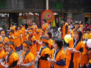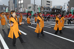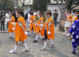 | トランペット鼓隊も同じ衣装で行列しました。 新通り小学校から、駿府城までのコースです。 |