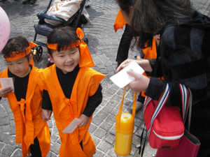 | そしてなにやら、道行く人に配っています。 何でしょうか? |