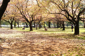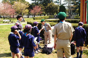 | ロープをつかったり、歩測をしたり、体を使って いろいろな物を計ってゲームです。 満開の桜の下で、気持ちのいい集会でした。 |