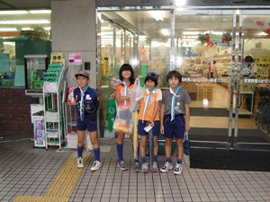 | 今日の集会は、1泊宿泊訓練。 いつもの青少年会館も、不安でいっぱいです。 カブ隊は、食材の買出し訓練。 近所のスーパーでパチッ。 |