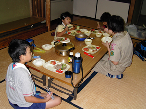 | 朝食です。 ビーバーはお得意の 『ビーバーサンド』 これも立派な調理ですよ。 普段、野菜を食べないスカウトも 食べられるようになる魔法のメニューです。 |
