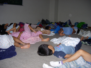 | 夜は、団委員による、スライド上映会。 日本版七夕のお話。 みんなが知ってるのは、 中国のお話だそうだ。 御伽草子の中から 「天稚彦草紙」 (あめわかひとぞうし)です。 |