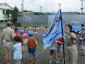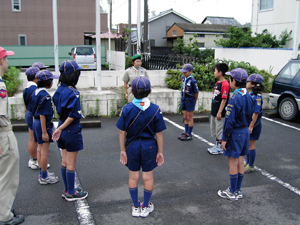 | 朝礼風景。 締めるところはピシッと。 ここが、スカウトらしいところ。 隊長の講評の後は、 安倍川に行って・・・・・ |