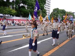 | その後は、富士地区のスカウトと お祭りパレードに参加。 後方の隊旗群と行進スカウトが 富士地区の仲間です。 |