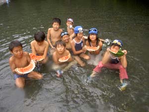 川に入って涼みながら スイカを食べる |