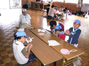 自分たちで摘んだ草で、 染物にも挑戦。 |