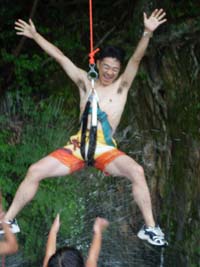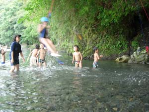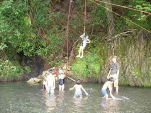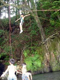 | こちらは”空中のブランコ” | 魚とりにもチャレンジ。 | 以前の集会で作った”ぬかびん”を、 即席に作って仕掛けてみた。 なんと、オイカワが捕れた。 マジですごいぜ!!! |