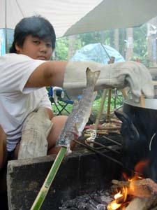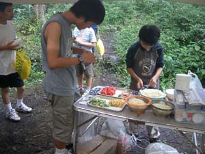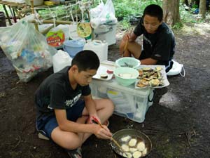 | こちらはボーイ隊のキャンプ | 副長2名と、訪問の育成会長、団委員長 | スカウトは炊事の最中 メニューはてんぷら うまそう |