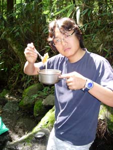 隊長もご満悦です。 | 川で釣った山女もおかず。 天然もので最高ですね。 料理、頼むよ!!! |