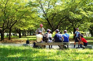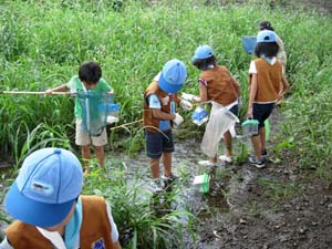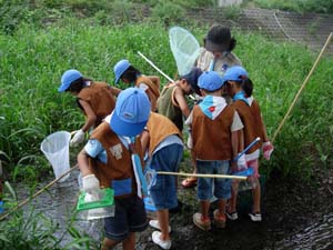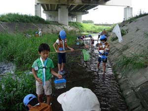 ビーバーは小坂川に集まりました。 みんな、タモを持て、魚やえびを取っています。 |