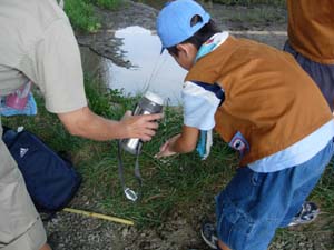 | 川から上がったら、 水筒の水で手を洗います。 中身を水にしている理由は そのためです。 |