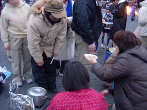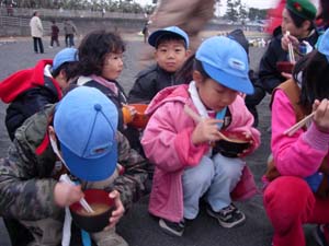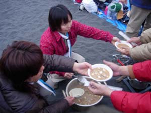 | そして、その後は、お楽しみ。 団委員会特製の、ブタ汁とお汁粉。 |