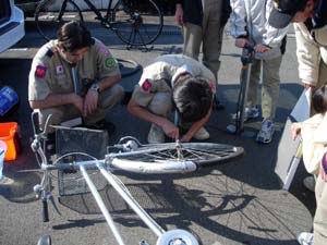 | ボーイ隊は、 来月のサイクリングに備えて、 パンク修理。 静岡は、自転車王国なので、これくらいはね。 |
