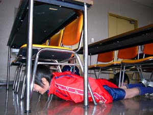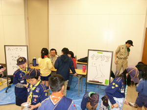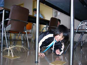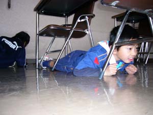 | 今日は、カブ隊の集会。 イスの下にもぐりこんで、 いったい何をしているのでしょうか?? |
