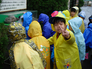 | ビーバー隊は、動物園に行きました。 しかし、雨雨雨・・・ たしか2年前の浜松動物園も雨・ でも、元気です。 カッパを着て、園内を普通に見学しました。 |