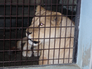 | 雨の日は、いいこともあります。 猛獣が、運動場でなく、宿舎にいるので、 近くで見られます。 ライオンの迫力はものすごい。 にらめっこをしたけれど、隊長がビビッてました。 |