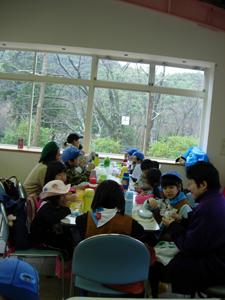| お昼はレストハウスを借りて。 いつものスカウト弁当です。 今日は「足りない」と言っているスカウトが 多かったです。 |