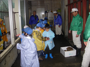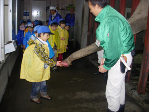 | ひとりひとりが、ゾウにえさやりです。 近くで見て、すごいです。 みんな緊張いっぱい。 |