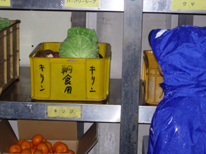 | その次は、動物のレストラン見学。 キリンの明日の朝食を発見。 新鮮な野菜です。 |