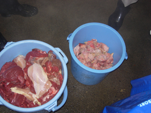 | こちらは肉食用。 左のバケツは、馬肉だそうです。 右は・・・・・ |