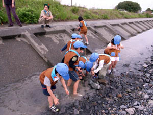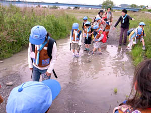 | ビーバー隊の集会です。 今週はずっと雨だったので、 安倍川の水が多くて・・ どこもかしこも水溜り・・・ じゃぶじゃぶじゃぶ・・・・・・・・・ |