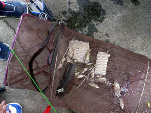 | 集会中に、大きな水溜りに 罠を仕掛けておきました。 フナ、タナゴ、モロコ。大漁です。 今回はリリースしましたが 今度は、容器を持って集合しましょう。 |