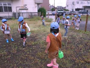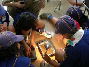 | カブ隊は、なにやら土を採集しています。 何を調べるのでしょうか??? 肥沃なところと、そうでない所。 組ごとに知恵を絞ってます。 |