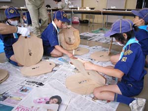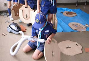 | カブ隊は、木工工作。 これ、何なんだ??? 紙やすりでせっせと磨き・・・・ |