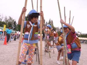 | 竹馬は難しいぞ。 ちなみにビーバー隊長は、一歩も歩けません。 なさけない〜〜〜 |