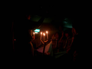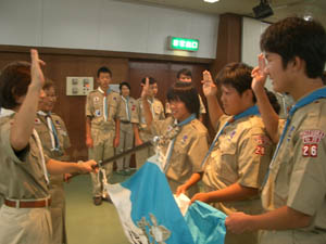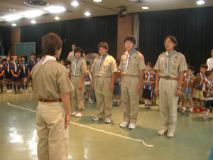 | そして、ちかいの式。 スカウトにとって、1番大切なとき。 ちかいを一つたてる毎に、 隊長がローソクに火を、ともします。 3つ揃って、いよいよ、ボーイスカウト。 |
