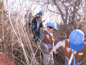 | ビーバー隊は、 ブッシュを抜けて探検です。 こんな草むらへっちゃら。 茨に気をつけて進みます。 |