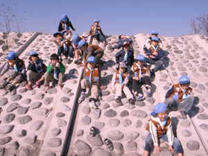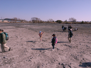 | 何と、 普段の安倍川に水がありません。 ここは、普段なら川の底。 掘ったら虫が出てくるし、 へんなにおいはするし・・・ 不思議探検です。 |