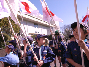 | カブ隊と、ビーバー隊は、国旗を持って、 パレードに参加です。 |