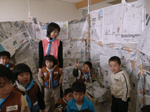 | みんなで工夫して、完成です。 新聞紙で作ったゲーム機、 テレビもあります。 スカウトみんなが入れる広さ。 |