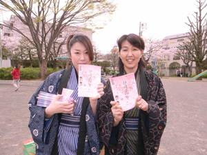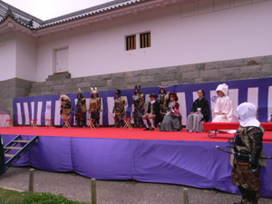 | さらにスペシャル瓦版屋さん。 似合いすぎだ・・・・・・・・・・ 行列の先頭で、パンフレットを配り、 登城行列が来た事を、市民に伝えます。 |