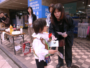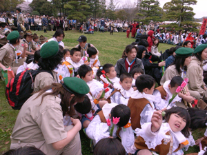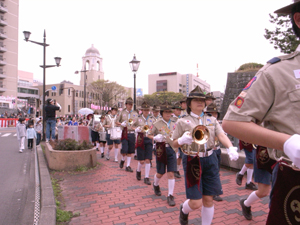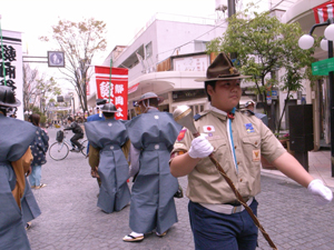 | 行列の途中で、 先週作ったビーバー隊の人形や カブ隊の、家康新聞を配りました。 |