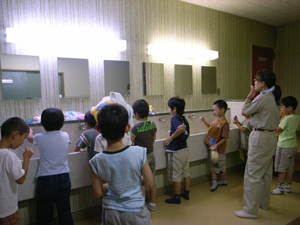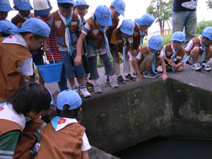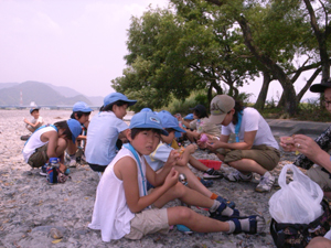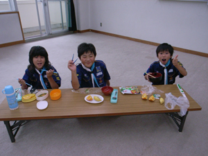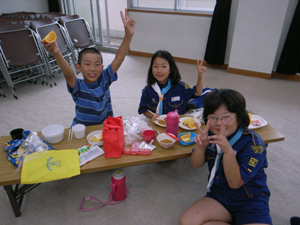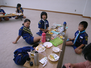 | おやつを食べて、一休みです。 夏の暑さにも、負けない元気な スカウトたちです。 |