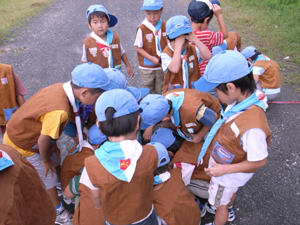 | カブ隊は、宿泊訓練 7月のキャンプに向けて、 組で様々な準備をしました。 特にキャンプファイアーの出し物決定!!! これは、とっても大事です。 |