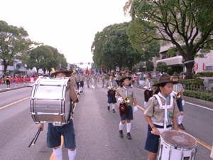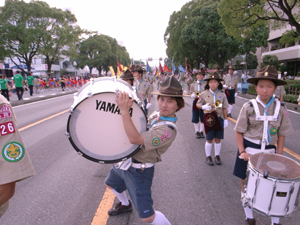 | 目抜き通りをパレードします。 富士のスカウトと一緒に。 気合入れていきました。 |