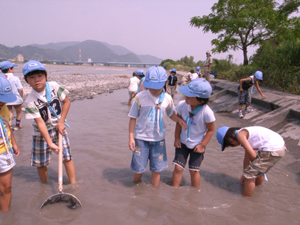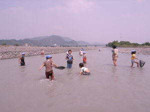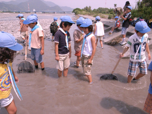 | ビーバー隊。 今日は安倍川で魚とり。 台風の影響で、流れに不規則な 水溜りができています。 |