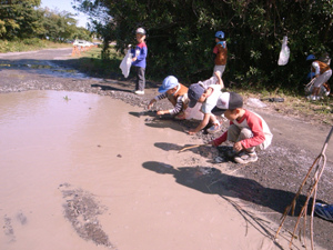 | 腹ごしらえした後は、 探検に出発。 こんなやぶもなんのその。 本当は、茨もあったりして、結構 大変なんです。 でも、ビーバーたちはへっちゃらだ。 |