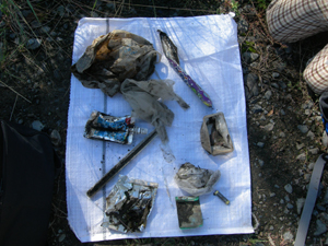 | みんな一生懸命に拾った 成果の一部です。 このあと、マシュマロ焼きに 舌鼓を打ちました。 もちろん、森は 綺麗になりました。 自分達の遊び場への感謝です。 さすがスカウト!!! |