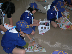 | カブ隊は、広告用紙で 何かを折っています。 箱のようですが・・・ |