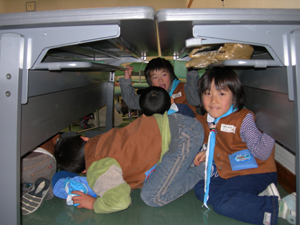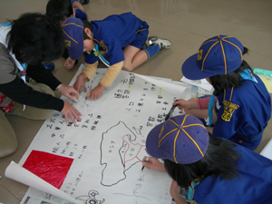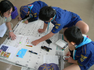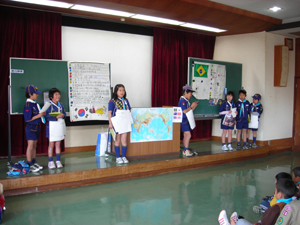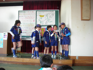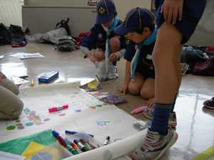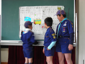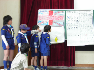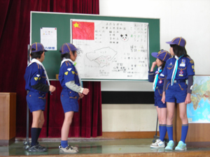 | 各組が工夫をしました。 そして、それを保護者の方や、 ビーバーにもみてもらいました。 こちらは韓国。 むかし、世界ジャンボリーが あったそうです。 |