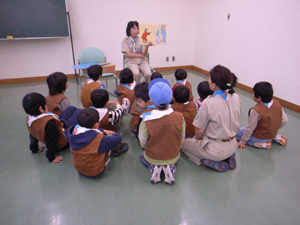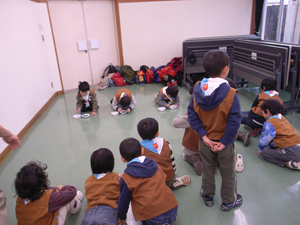 | ビーバーの集会は 雨のため室内に。 先ず、紙芝居 「オサルノラッパ」 |