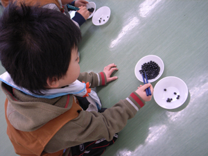 | そして、豆つかみ競争 節分にちなんで、黒豆です。 ツルツルと滑って、大変でした。 |
