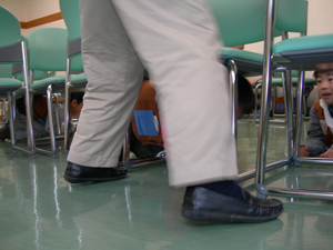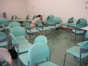 | イスの迷路をいきますが、 迷路からはみ出ると!! 怖い鬼が待っています。(副長) みんな気をつけろ。 |