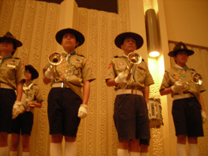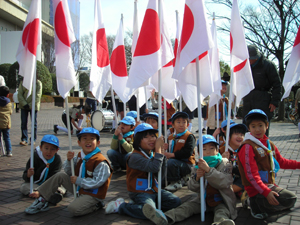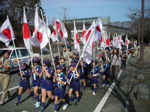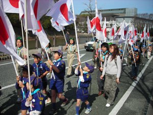 | 後ろはビーバー隊。 大きな国旗を持って、がんばれ。 |
