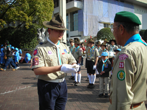 | そして、ベンチャーの 先輩スカウトが、宗教章を 授与されました。 もう一歩で「富士スカウト」です。 うれしいね。 |